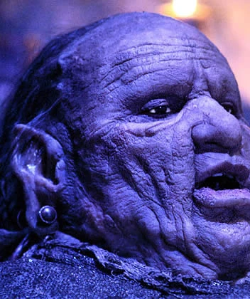 The Elder looked aged and had a swollen appearance, his skin shedding, he sat motionless on a stone chair cut from the rock. He is black and bald, with dark brown eyes, of medium height, has a very plump physique. He wears a fur vest, leather belt, bracelés de forces, large boxes held in front by a small copper ring.