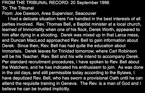 An ordained minister, and a friend of the latent immortal,Derek Worth, he was, of necessity, told of the existence of Immortals when a troubled Derek turned to him after his first death, and appeared in the Reverend's church, though he had died weeks earlier in the Reverend's arms. MacLeod opted to trust him, and took him to Joe's tavern for a drink and information.